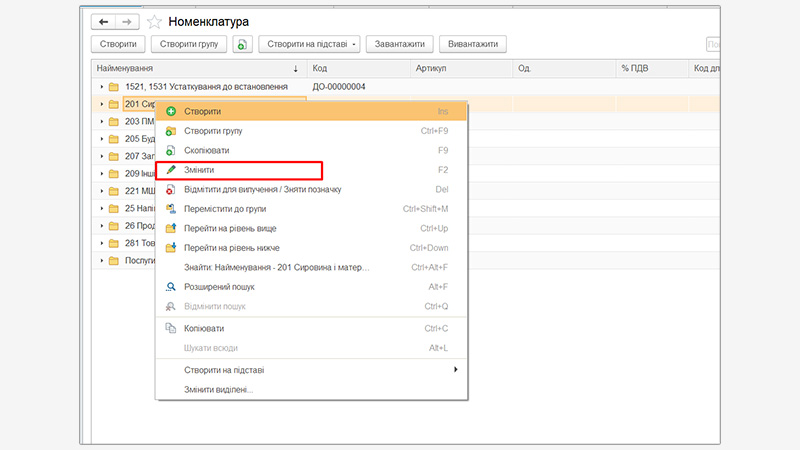 Проводимо налаштування рахунків під кожну групу окремо. Виділяємо, наприклад, групу 201 Сировина і матеріали. Виводимо правою кнопкою миші командну панель —