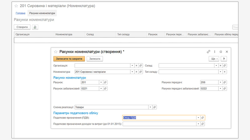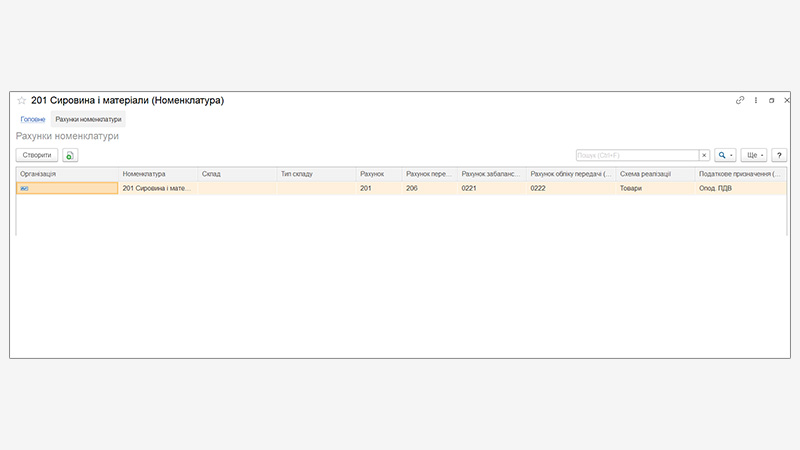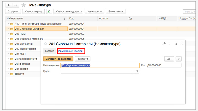 Командою Створити створюємо налаштування для групи 201 Сировина і матеріали.