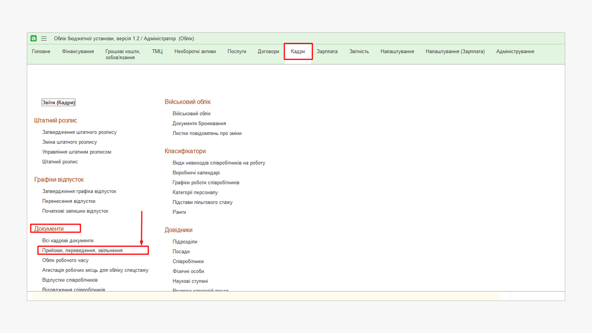 Шлях до документа прийом на роботу: Підсистема Кадри — Документи — Прийом, переведення, звільнення.
