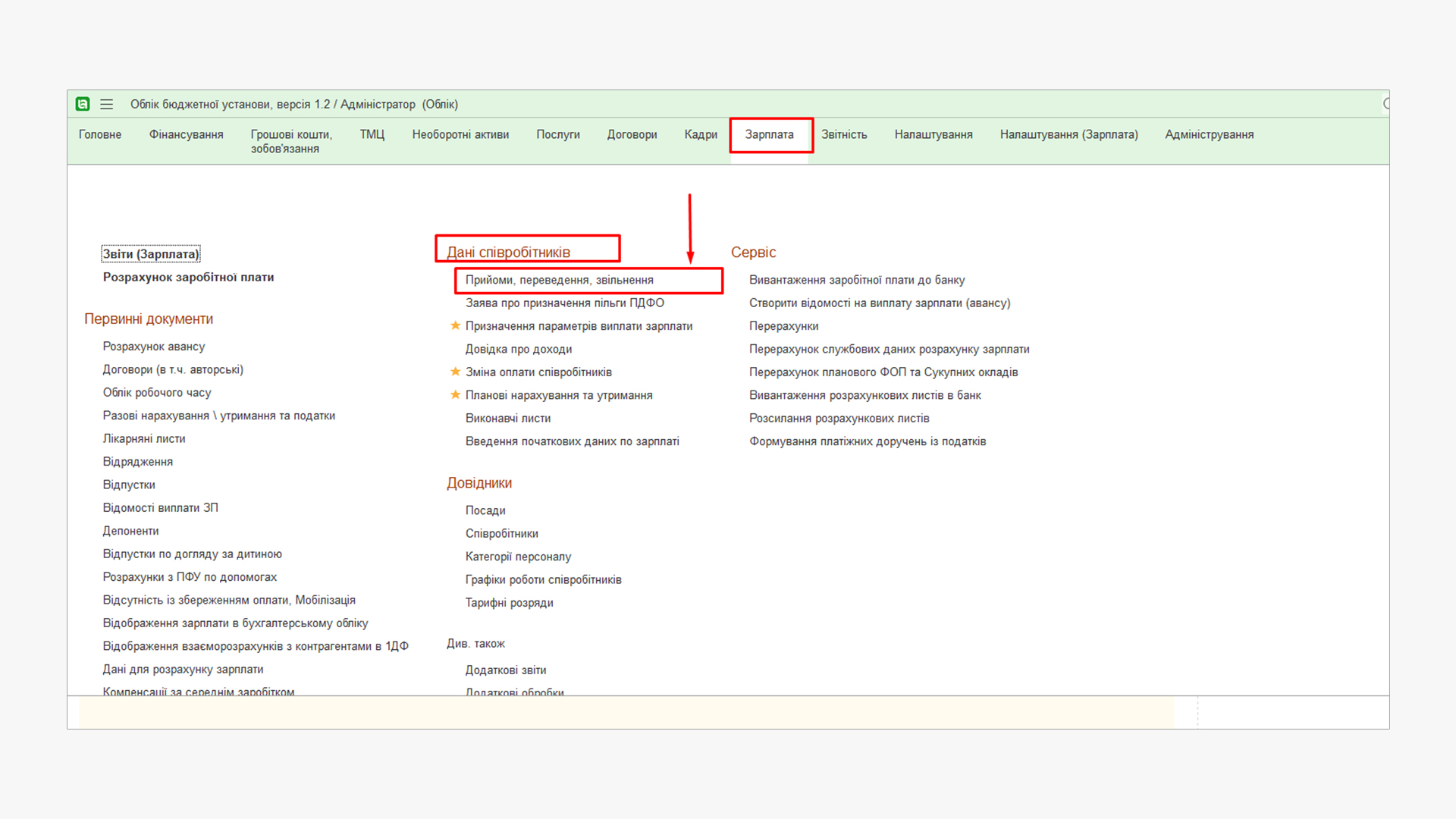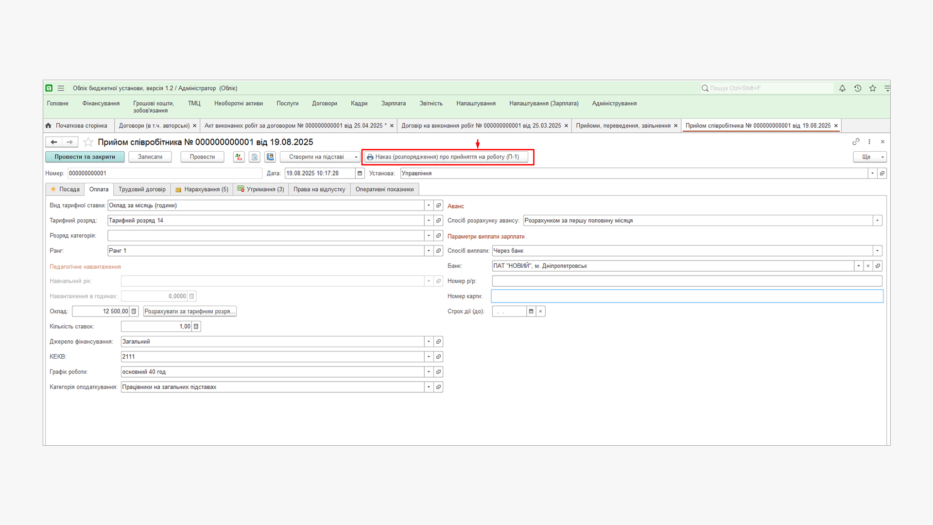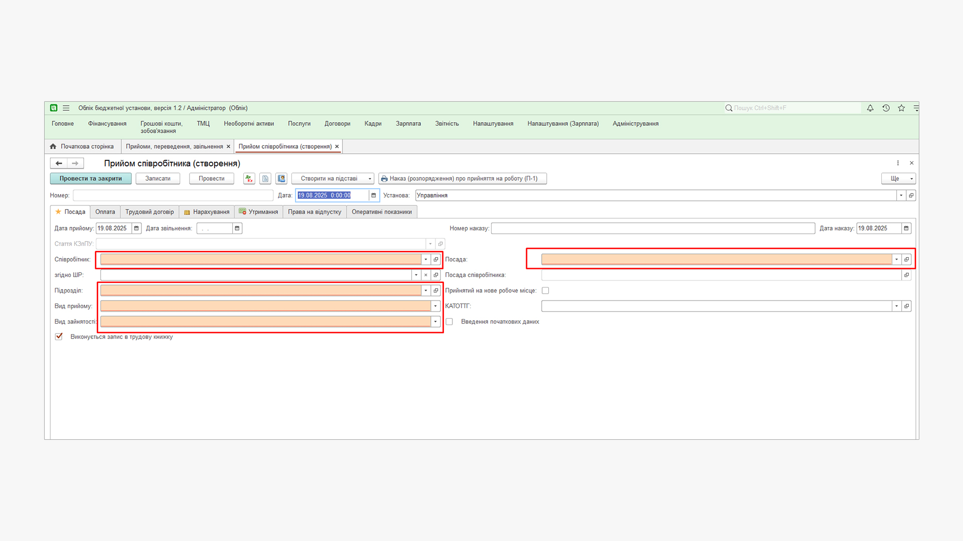 Або інший шлях до документу: Підсистема Зарплата — Дані співробітників — Прийом, переведення, звільнення