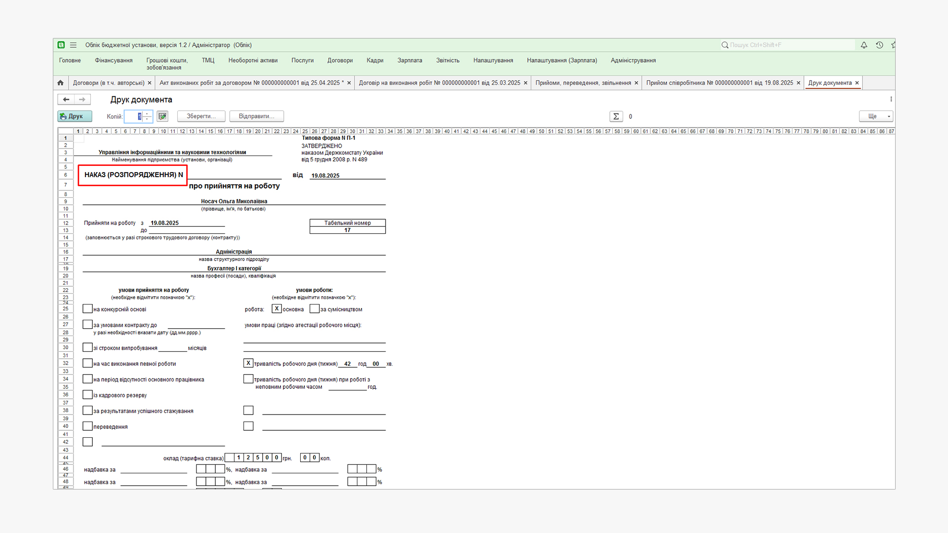 Наказ у програмі Облік бюджетної установи можно роздрукувати з документу прийом на роботу співробітника.