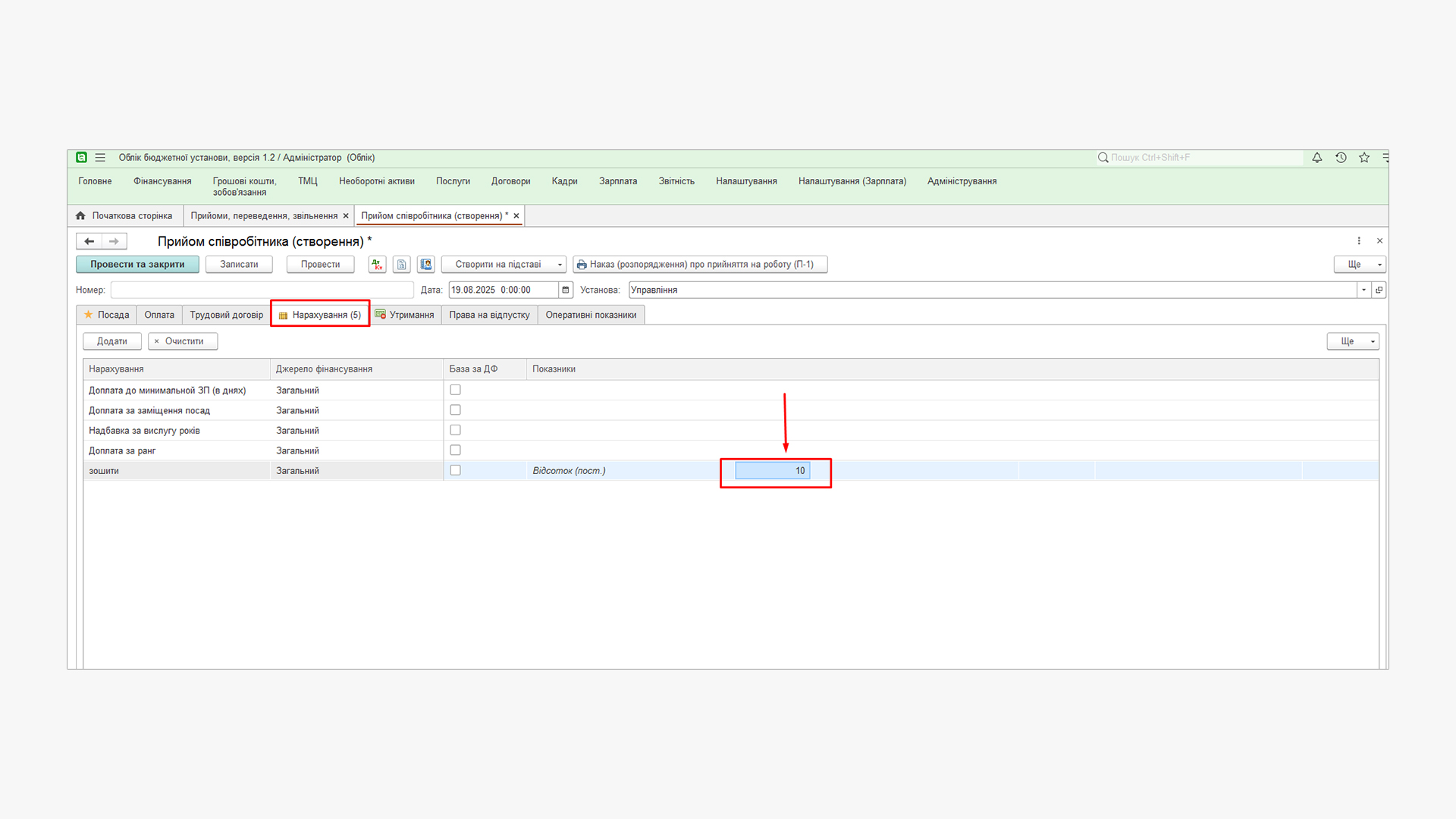 Заповнюємо вкладку Нарахування. В неї ми вносимо лише постійні нарахування та доплати, які не змінюються впродовж всього часу! Якщо є процентні показники, також сюди.