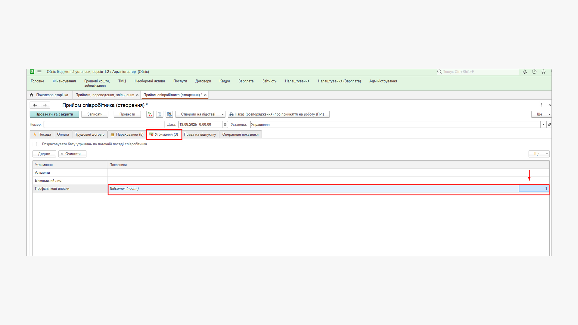 Заповнюємо вкладку Утримання. Тут вносяться дані, якщо працівник має постійні утримання — виконавчий лист, профспілкови внески або аліменти.