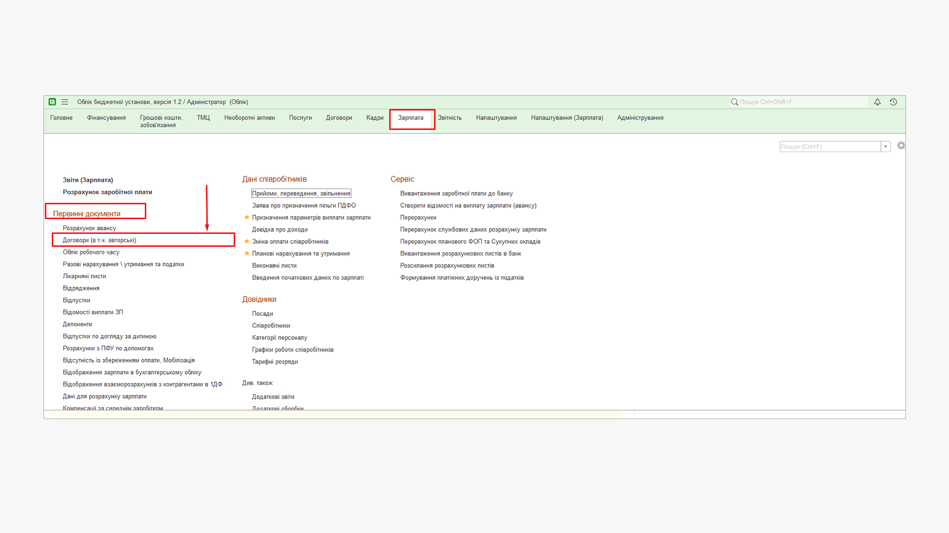 Шлях до створення документу договір ЦПХ та Акт виконаних робіт у програмі: Підсистема Зарплата — Первинні документи — Договори.