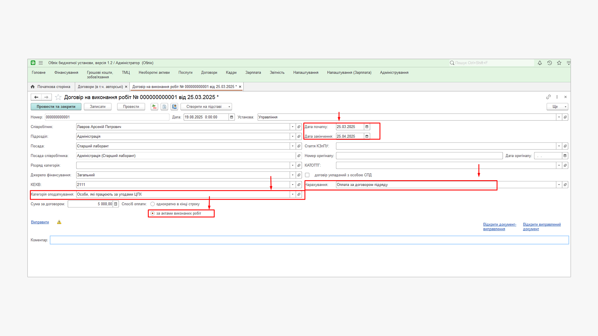 Розглянемо приклад прийняття працівника на умовах трудового договору ЦПХ в програмі Облік бюджетної установи.