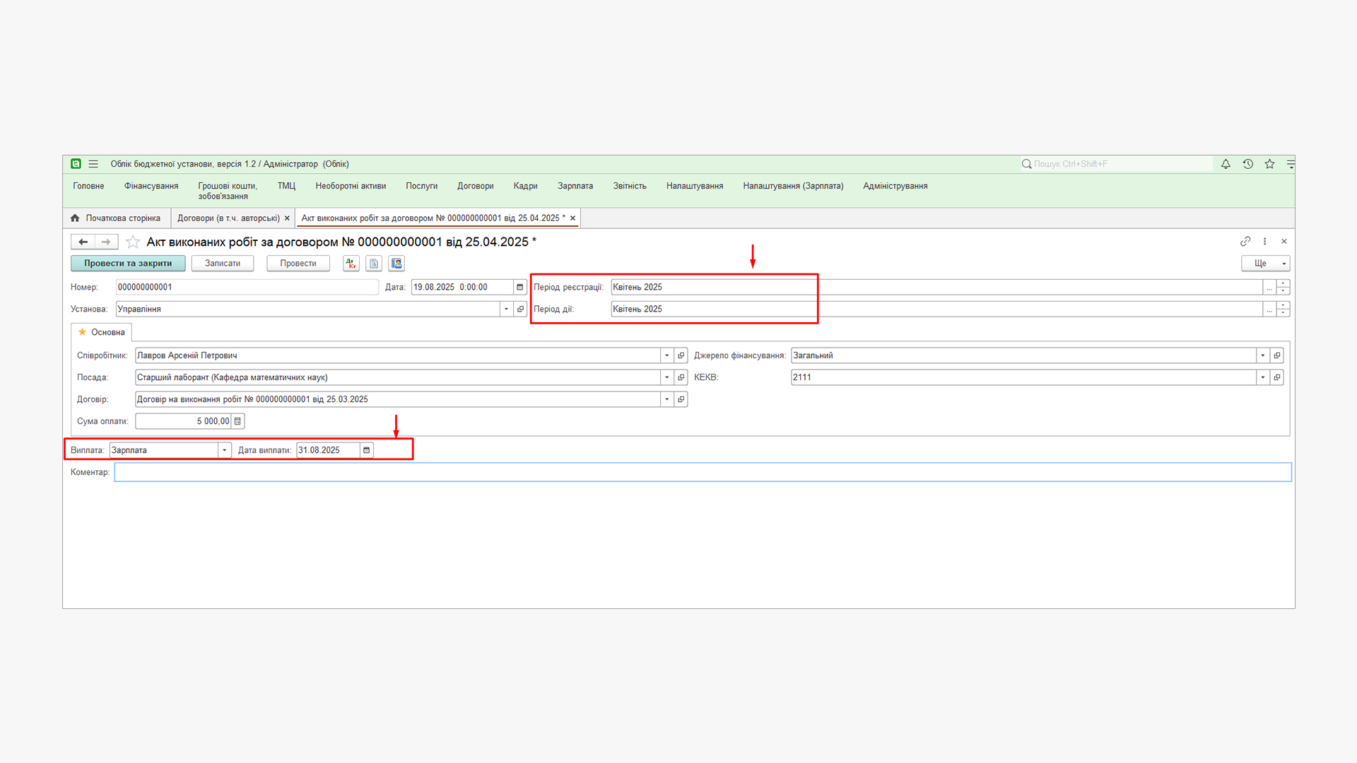 Період реєстрації і період дії показує у якому місяці буде виплата заробітної плати за договором ЦПХ. Якщо у вікні Виплата ви виберете опцію заробітна плата, ця сума підтягнеться