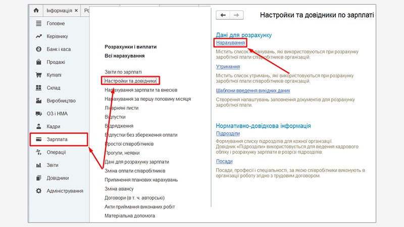 Меню: Зарплата — Настройки та довідники — Нарахування