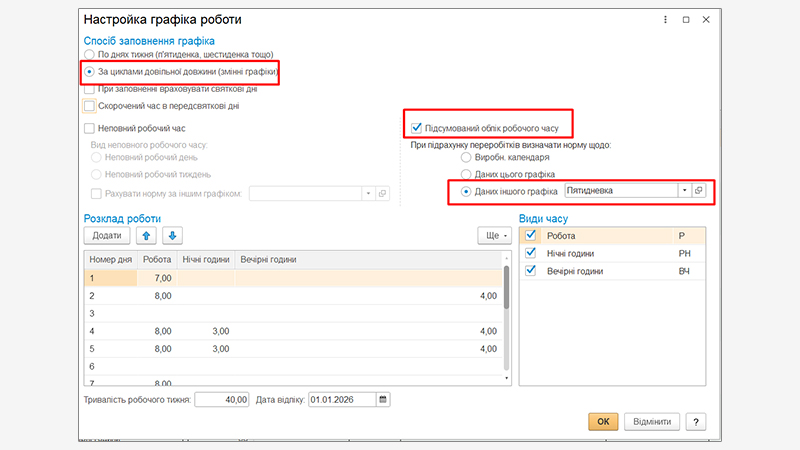 Для коректного визначення перероблених годин необхідно правильно заповнити графік роботи.