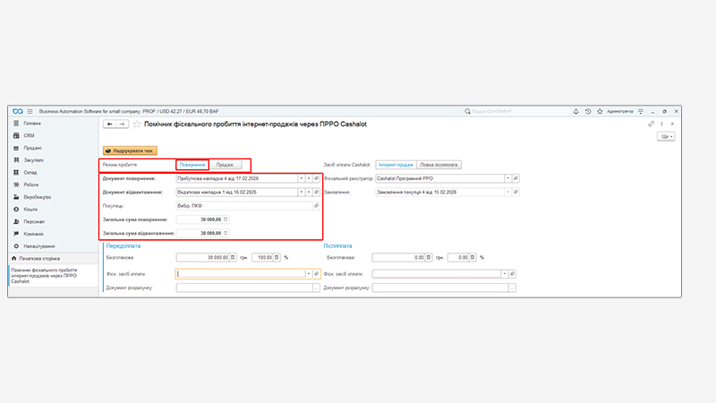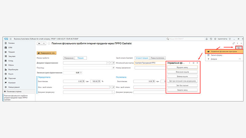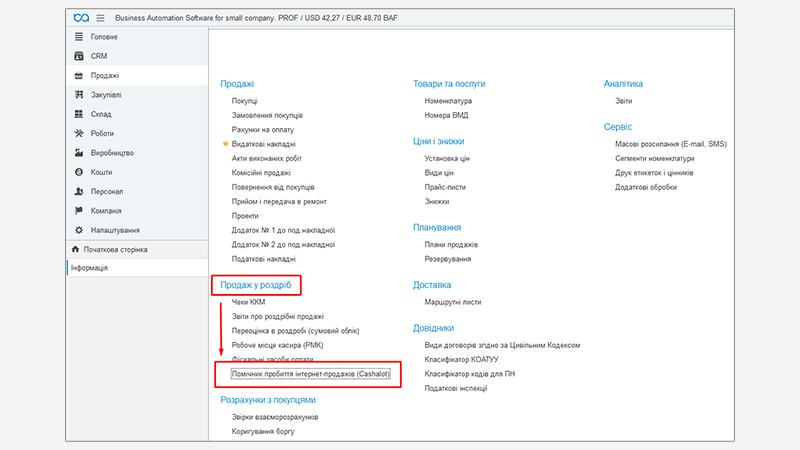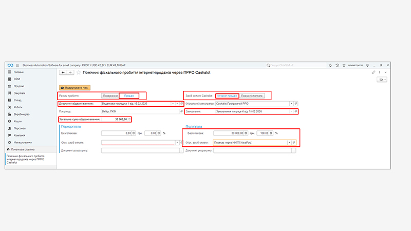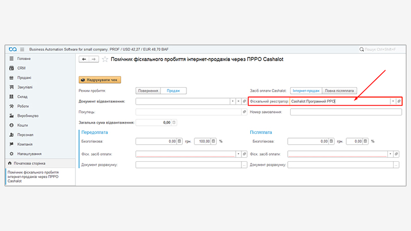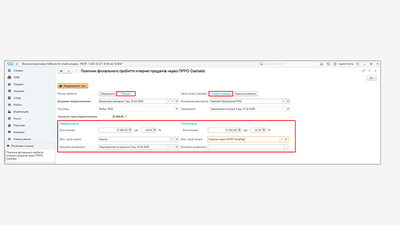 У BAS Малий бізнес для цього використовується помічник пробиття інтернет-продажів через ПРРО Cashalot — інструмент, який дозволяє інтегрувати фіскалізацію безпосередньо в облікові операції.