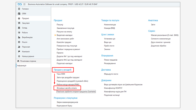 Довідник доступний в розділі: Продажі → Продаж у роздріб → Фіскальні засоби оплати.