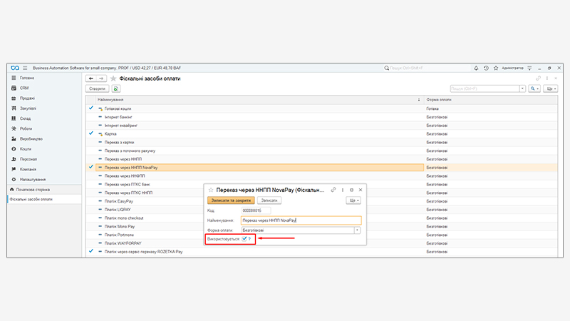 встановити ознаку «Використовується» для тих способів оплати, які будуть застосовуватись для інтернет-продажів.