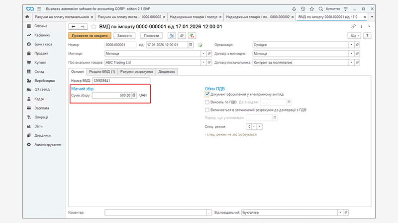 У цьому документі потрібно заповнити суму митного збору та ставки мита і ПДВ. Після цього програма автоматично розрахує суму мита та ПДВ.