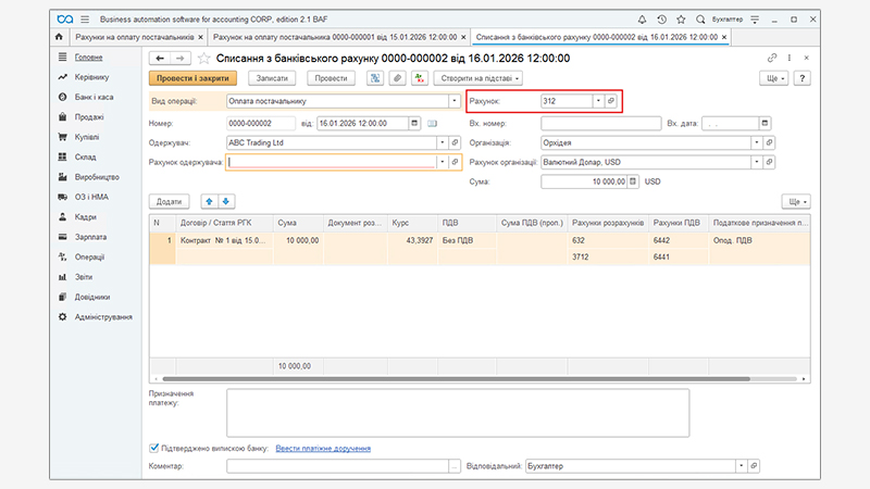 Всі необхідні реквізити заповнюються автоматично. Рахунок, з якого оплачуємо — 312.