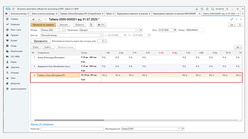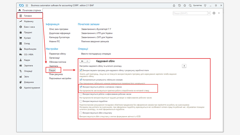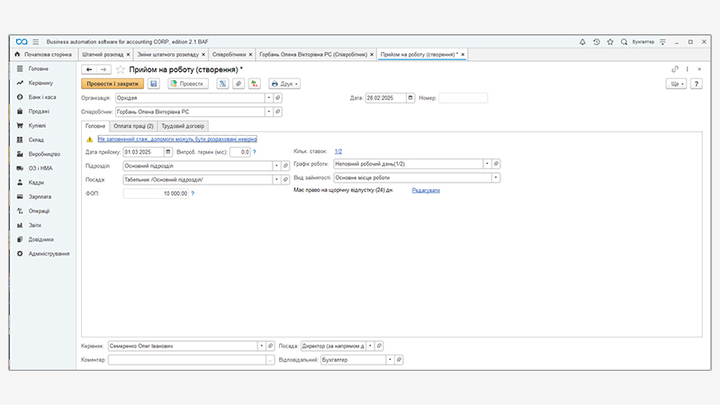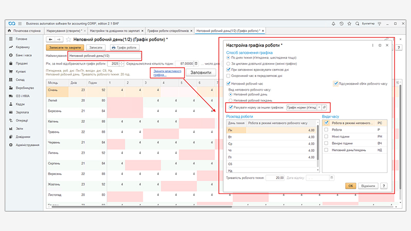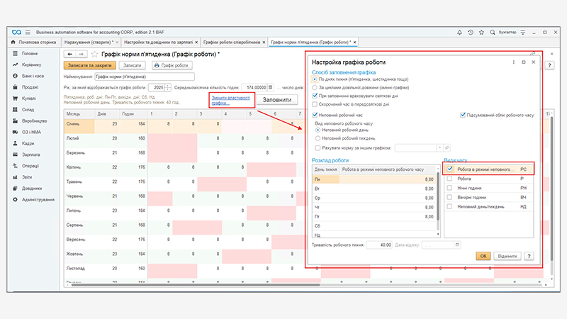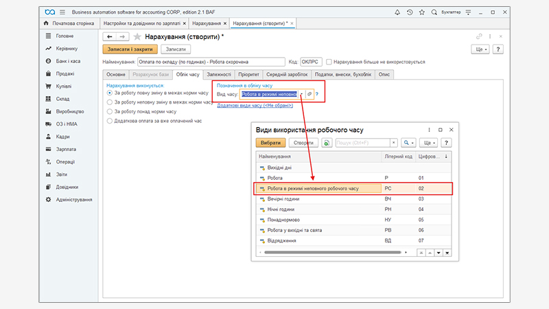 BAS Бухгалтерія КОРП підтримує гнучкі сценарії роботи з персоналом, зокрема облік неповного робочого часу, різні графіки та автоматичні пропорційні розрахунки.