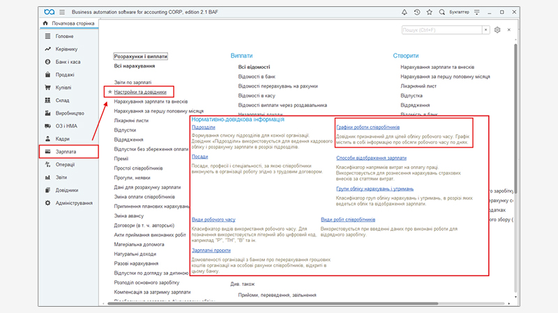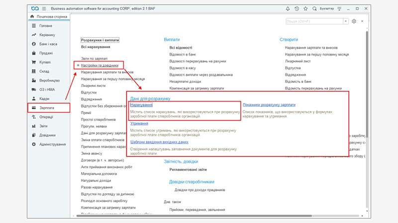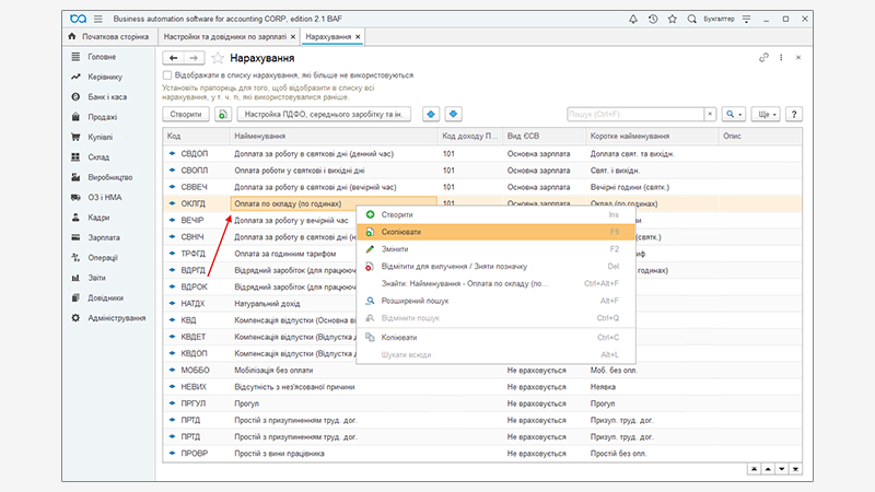 копію. Заходимо в «Зарплата» — «Настройки та довідники» — «Нарахування».