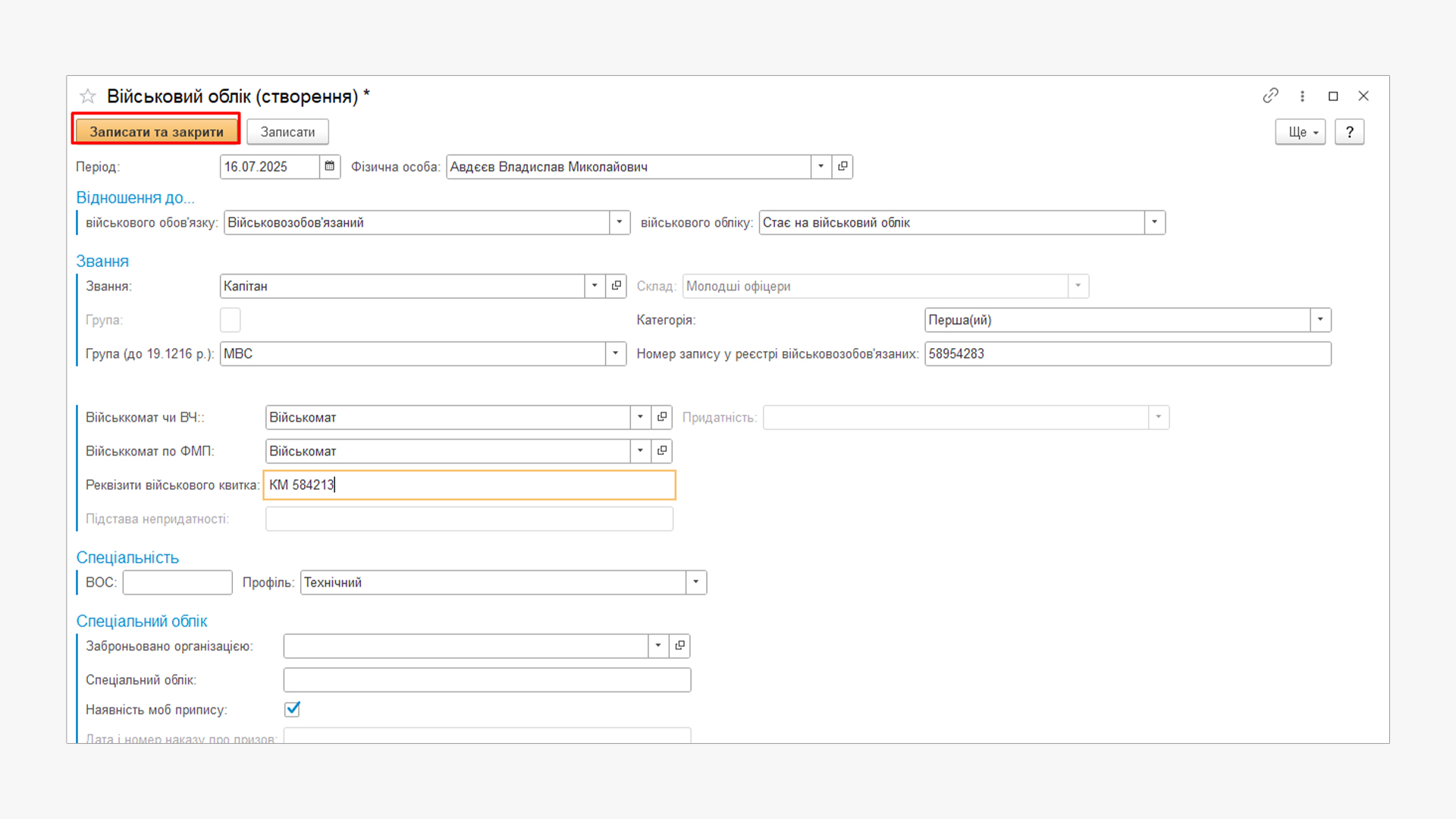 Незаповнені обов’язкові поля. Переконайтеся, що всі реквізити, такі як ВОС чи категорія обліку, заповнені.