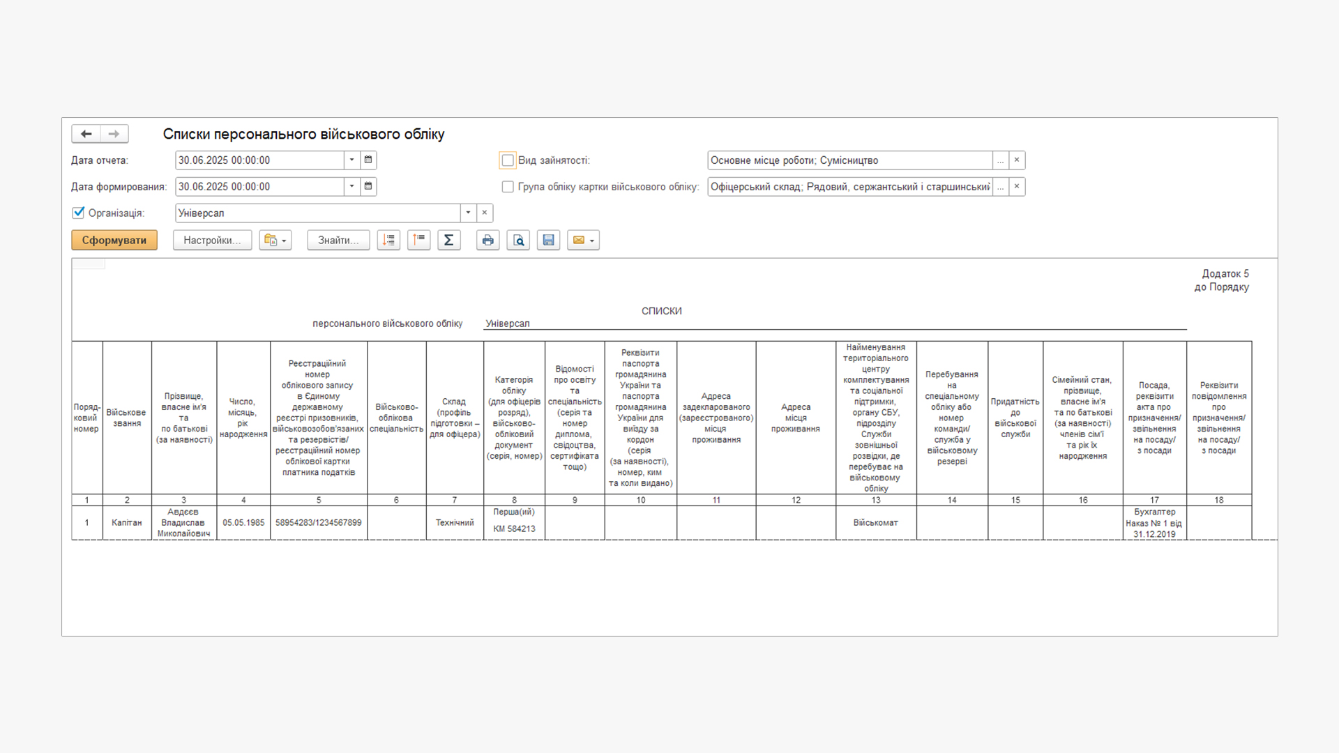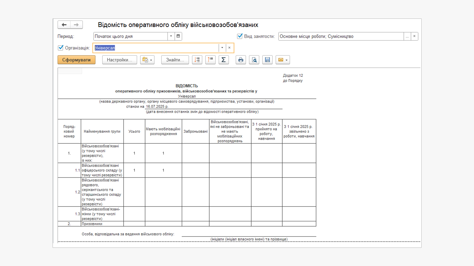 Примітка:Якщо звіт формується порожнім, перевірте, чи заповнені всі необхідні реквізити в регістрі «Військовий облік».