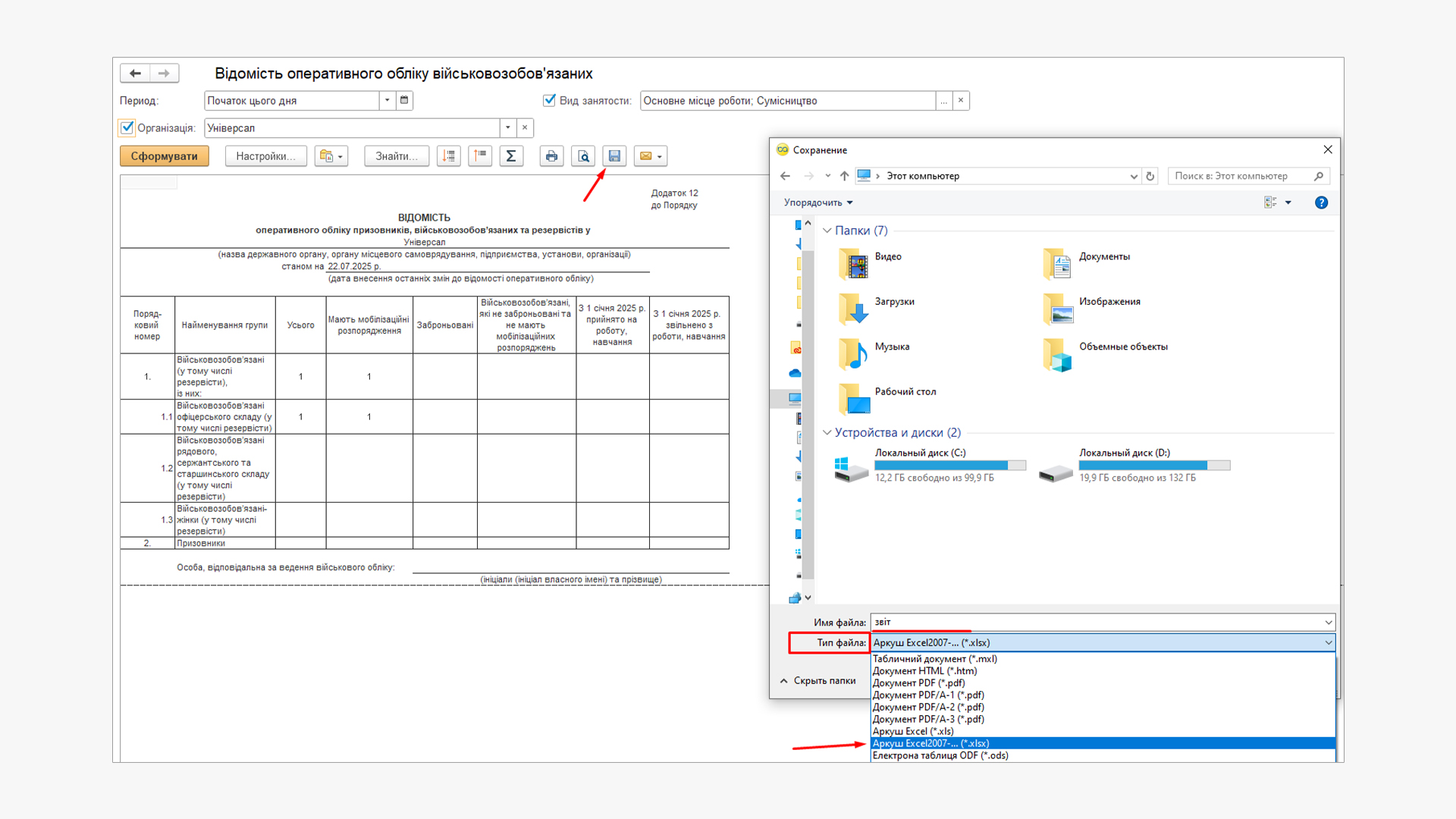 Після формування звітів їх можна експортувати у формати Excel або PDF для подання до територіальних центрів комплектування (ТЦК).