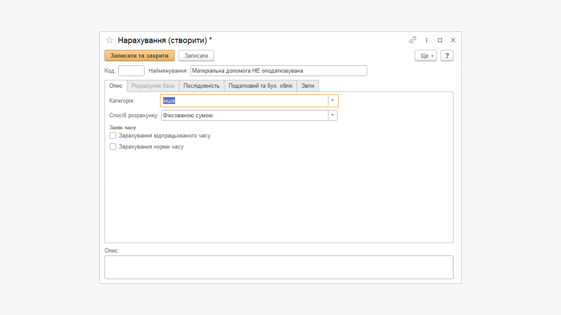 На вкладці Опис у Категорії має бути вид Інше, а в Способі розрахунку — Фіксованою сумою.