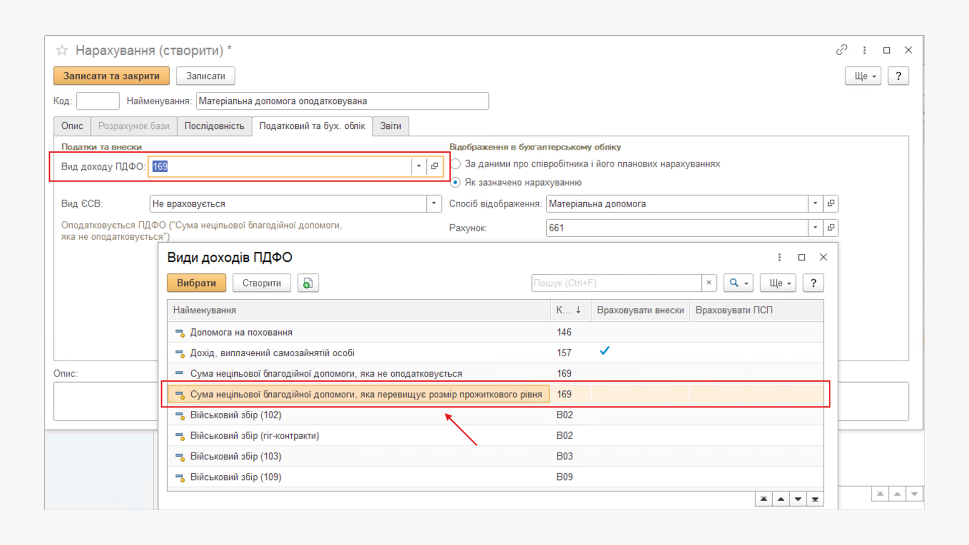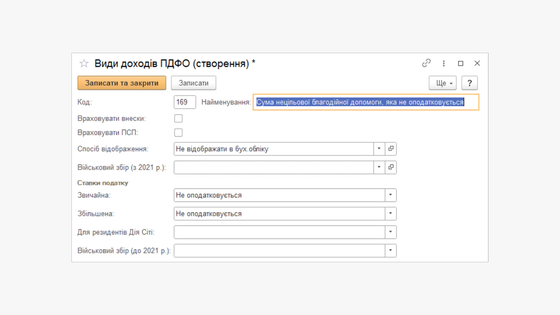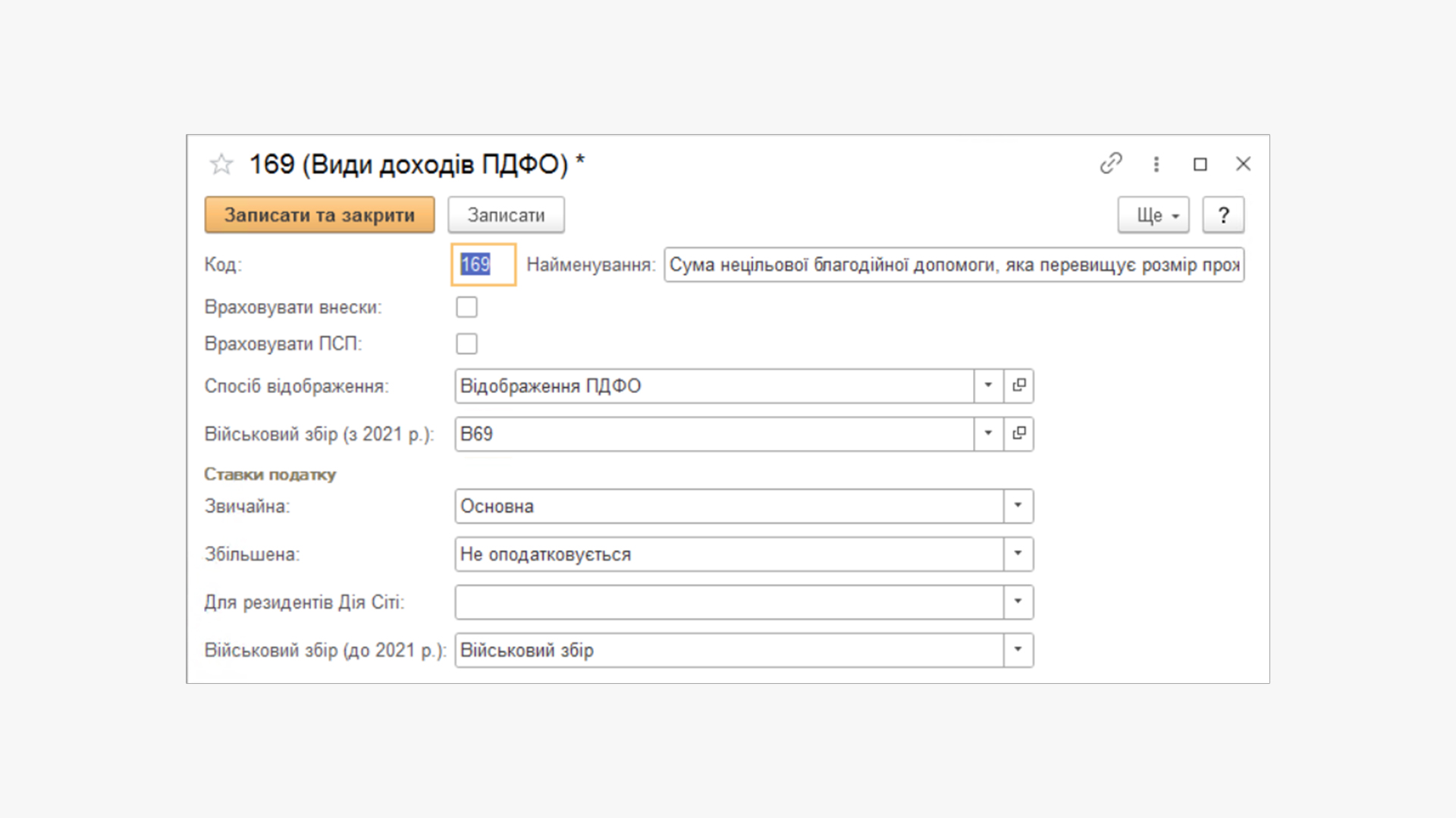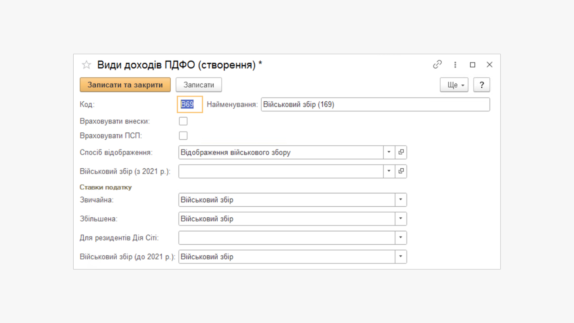 Для початку створимо вид доходу Військовий збір для оподатковуваної матеріальної допомоги (рекомендуємо задати для нього код В69, тобто будемо мати ПДФО з кодом 169 та