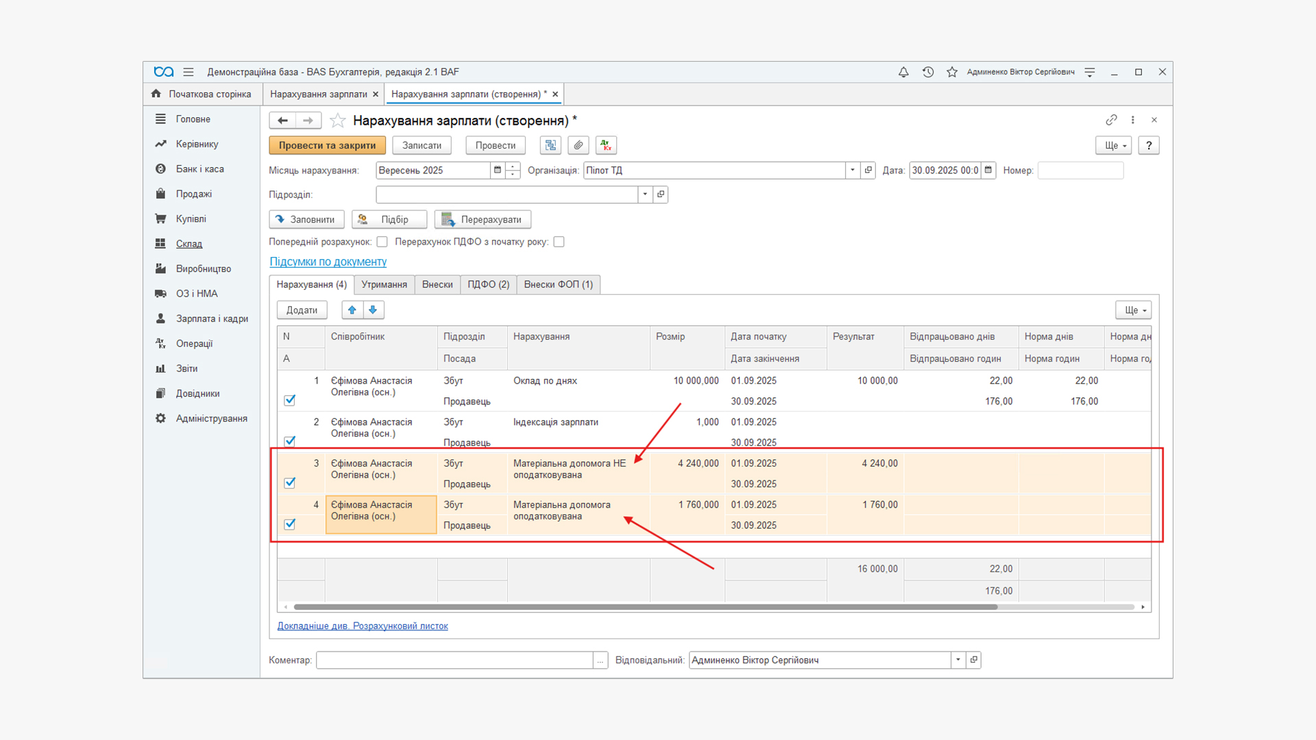 Аналогічно заповнюємо інший рядок, тільки у виді Нарахування вказуємо ≪Матеріальна допомога оподатковувана≫ та прописуємо суму матеріальної допомоги, яка перевищує суму