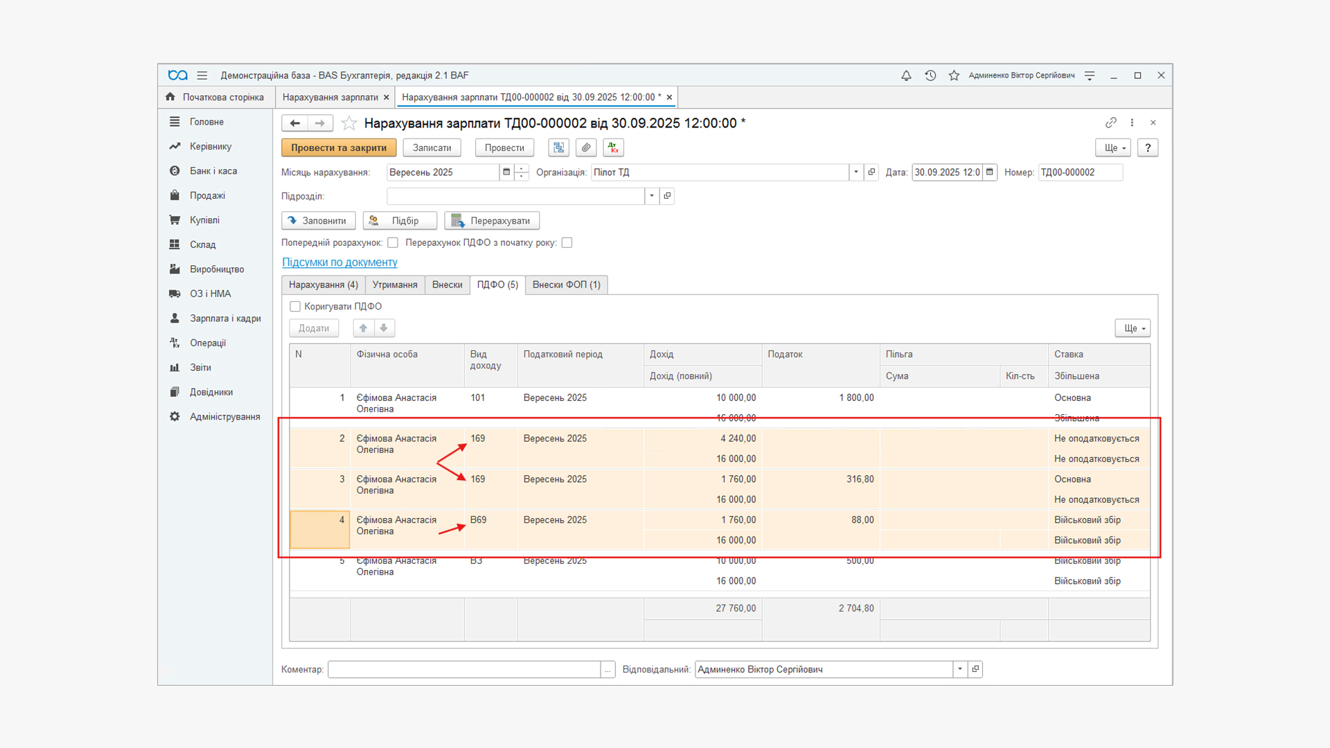 Показано, що на вкладці ПДФО програма вірно розділила дохід та порахувала податки.