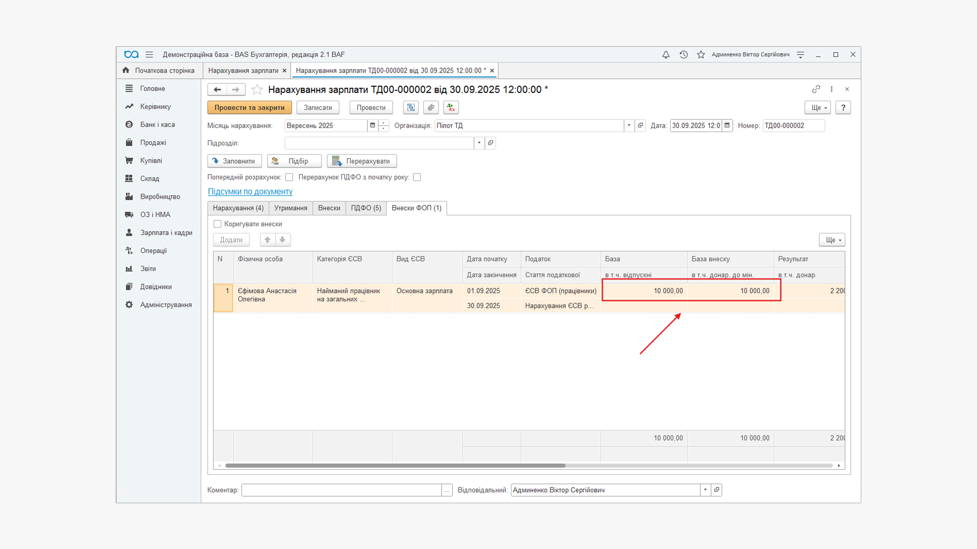 не належить до фонду оплати праці (п. 3.31 інструкції №5). Відповідно, вона не є базою для нарахування ЄСВ. Тому в нашому прикладі програма розраховує внески з 10000,00 грн, а не