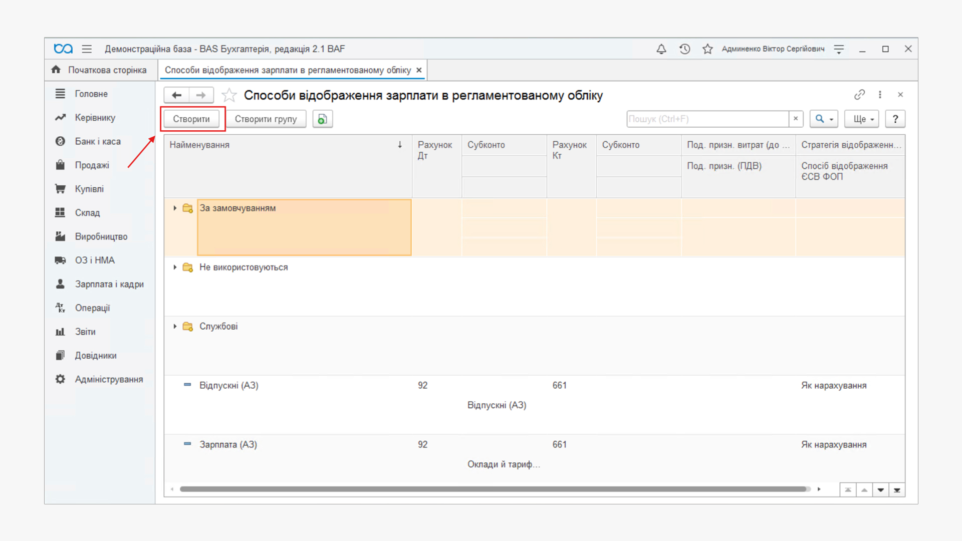 У довіднику Способи відображення зарплати в регламентованому обліку натискаємо кнопку Створити.