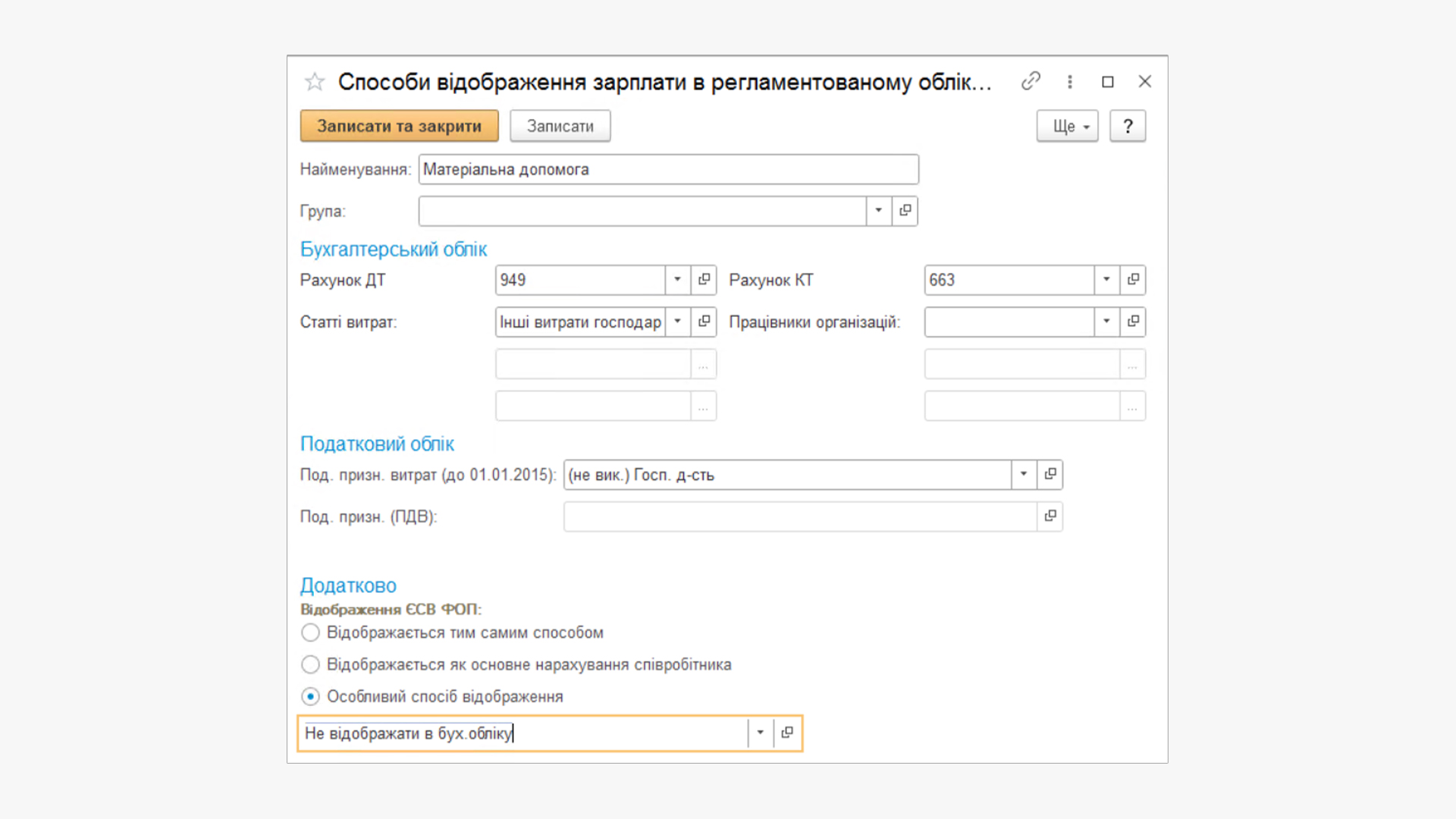 Відображення ЄСВ ФОП — Особливий спосіб відображення — Не відображати в бух. обліку (оскільки разова матеріальна допомога не входить в базу нарахування ЄСВ).