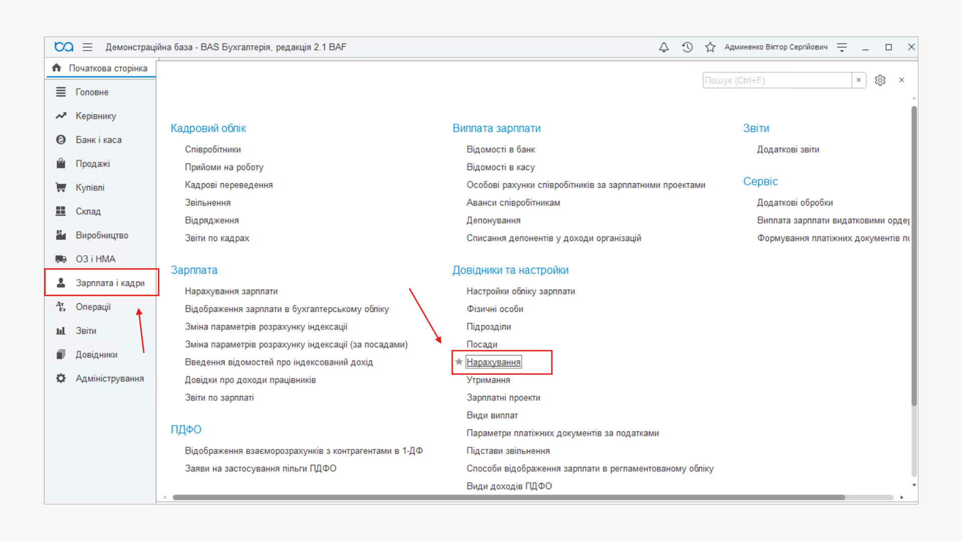 Переходимо у розділ Зарплата та кадри — Довідники та настройки — Нарахування.